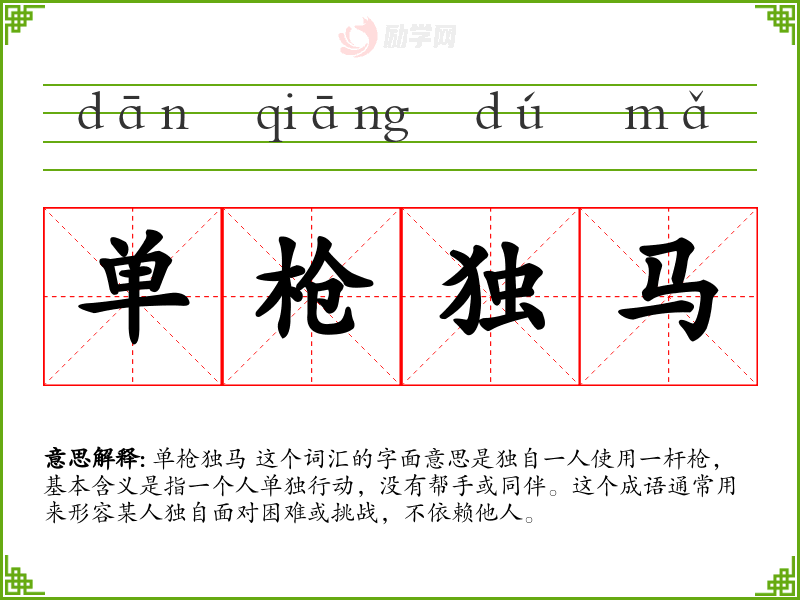 单枪独马 这个词汇的字面意思是独自一人使用一杆枪,基本含义是指一个人单独行动,没有帮手或同伴。这个成语通常用来形容某人独自面对困难或挑战,不依赖他人。