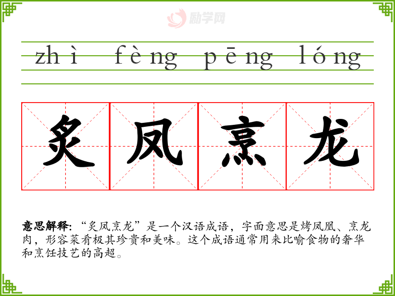 “炙凤烹龙”是一个汉语成语,字面意思是烤凤凰、烹龙肉,形容菜肴极其珍贵和美味。这个成语通常用来比喻食物的奢华和烹饪技艺的高超。