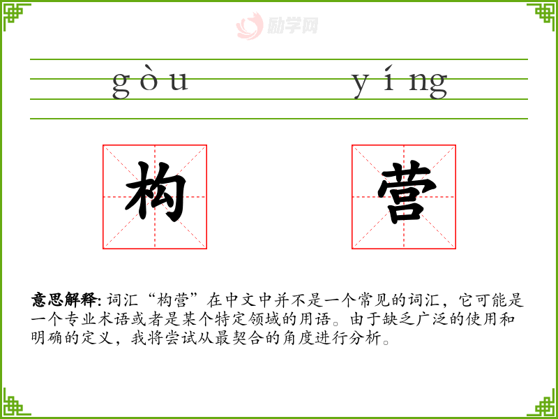 词汇“构营”在中文中并不是一个常见的词汇,它可能是一个专业术语或者是某个特定领域的用语。由于缺乏广泛的使用和明确的定义,我将尝试从最契合的角度进行分析。