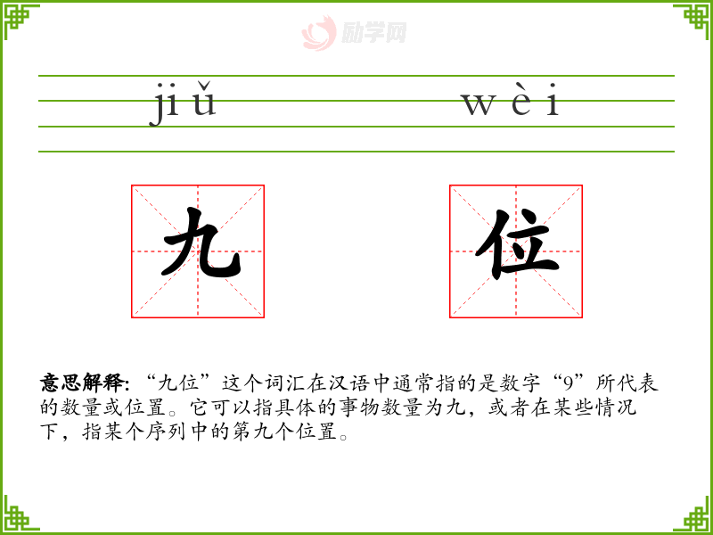 “九位”这个词汇在汉语中通常指的是数字“9”所代表的数量或位置。它可以指具体的事物数量为九,或者在某些情况下,指某个序列中的第九个位置。