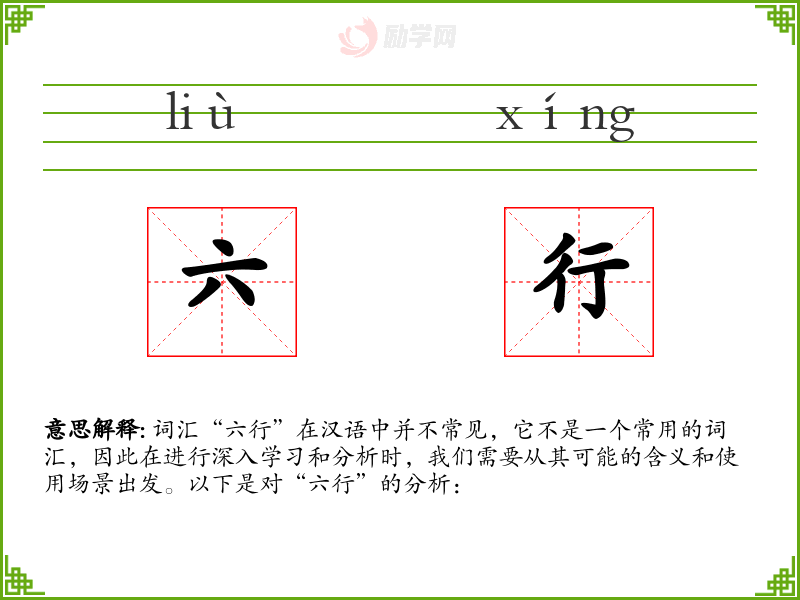 词汇“六行”在汉语中并不常见,它不是一个常用的词汇,因此在进行深入学*和分析时,我们需要从其可能的含义和使用场景出发。以下是对“六行”的分析: