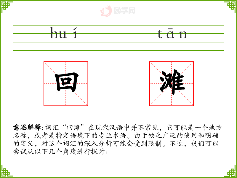 词汇“回滩”在现代汉语中并不常见,它可能是一个地方名称,或者是特定语境下的专业术语。由于缺乏广泛的使用和明确的定义,对这个词汇的深入分析可能会受到限制。不过,我们可以尝试从以下几个角度进行探讨: