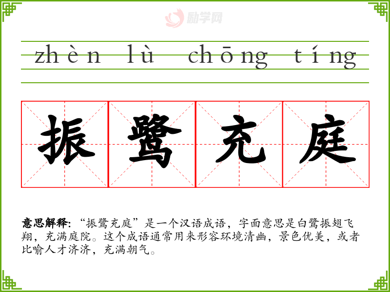 “振鹭充庭”是一个汉语成语,字面意思是白鹭振翅飞翔,充满庭院。这个成语通常用来形容环境清幽,景色优美,或者比喻人才济济,充满朝气。