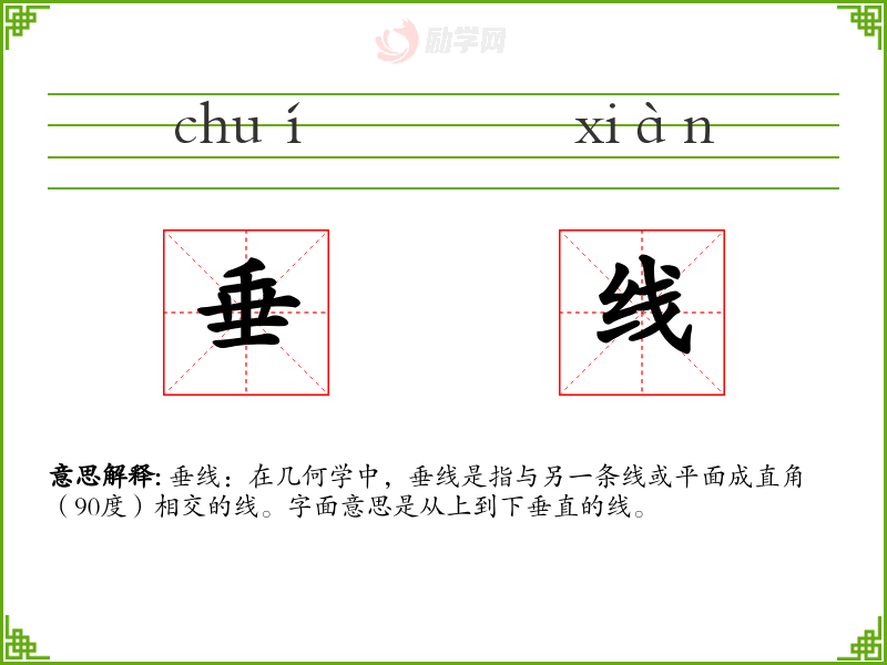 垂线:在几何学中,垂线是指与另一条线或平面成直角(90度)相交的线。字面意思是从上到下垂直的线。