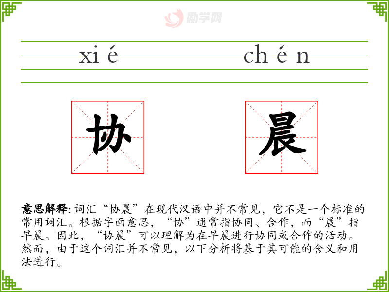 词汇“协晨”在现代汉语中并不常见,它不是一个标准的常用词汇。根据字面意思,“协”通常指协同、合作,而“晨”指早晨。因此,“协晨”可以理解为在早晨进行协同或合作的活动。然而,由于这个词汇并不常见,以下分析将基于其可能的含义和用法进行。