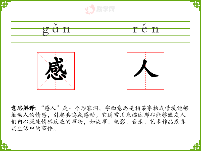 “感人”一词由“感”和“人”组成,其中“感”指感觉、感受,“人”指人类。这个词在中文中的使用历史悠久,其基本含义在长期的使用中保持相对稳定,但随着社会和文化的发展,其应用场景和表达方式有所扩展和变化。