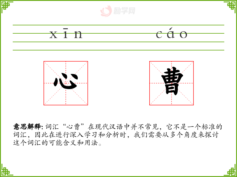 词汇“心曹”在现代汉语中并不常见,它不是一个标准的词汇,因此在进行深入学习和分析时,我们需要从多个角度来探讨这个词汇的可能含义和用法。