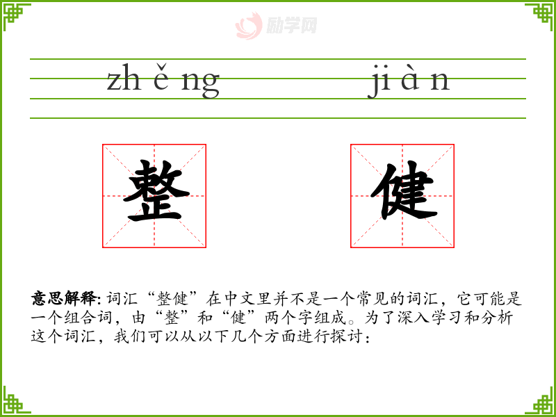 词汇“整健”在中文里并不是一个常见的词汇,它可能是一个组合词,由“整”和“健”两个字组成。为了深入学习和分析这个词汇,我们可以从以下几个方面进行探讨: