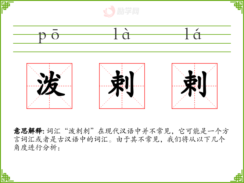 词汇“泼剌剌”在现代汉语中并不常见,它可能是一个方言词汇或者是古汉语中的词汇。由于其不常见,我们将从以下几个角度进行分析: