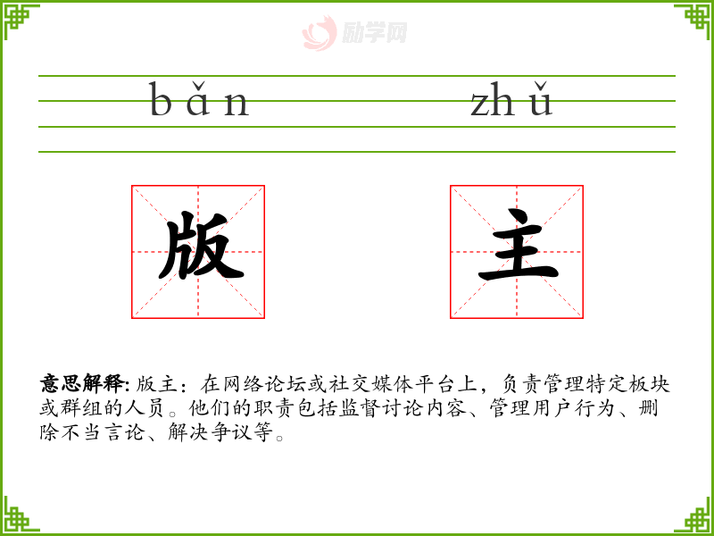 - 口语:在日常对话中,版主一词常用于描述网络社区的管理者,如“这个论坛的版主很严格”。