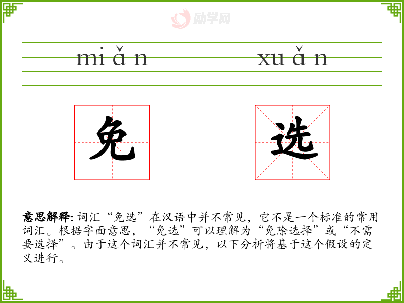 “免选”作为一个不太常见的词汇,其含义和用法需要根据具体语境来理解。在语言学习和表达中,了解这样的词汇可以帮助我们更准确地把握特定情境下的细微差别。