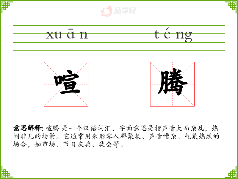 - 文学:在文学作品中,“喧腾”常用来描绘节日的喜庆场面或市场的繁华景象,如“春节的庙会上,人群喧腾,热闹非凡。”