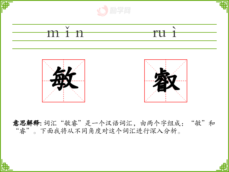 词汇“敏睿”是一个汉语词汇,由两个字组成:“敏”和“睿”。下面我将从不同角度对这个词汇进行深入分析。