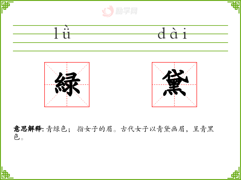 緑黛的意思是:青绿色; 指女子的眉。古代女子以青黛画眉,呈青黑色。