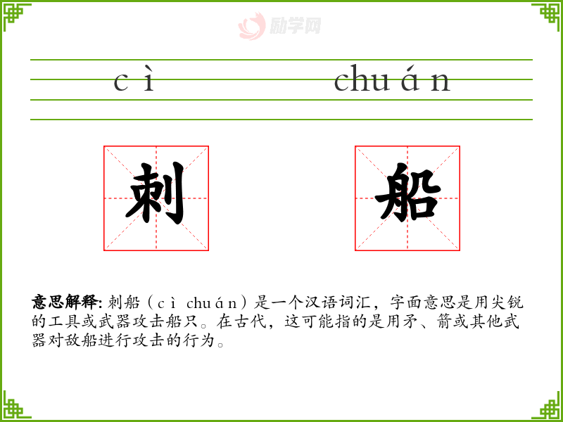 “刺船”这个词汇虽然不常用于现代语言,但它承载了丰富的历史和文化信息,对于理解古代战争和海上活动具有重要意义。在学*语言和历史时,了解这样的词汇可以帮助我们更好地理解过去的文化和生活方式。