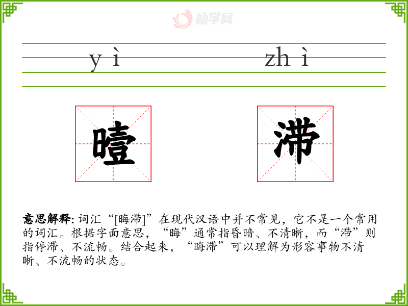 - 理解:“晦滞”是一个形容事物状态不清晰、不流畅的词汇,虽然在日常使用中不常见,但在特定语境和文学作品中具有一定的表现力。