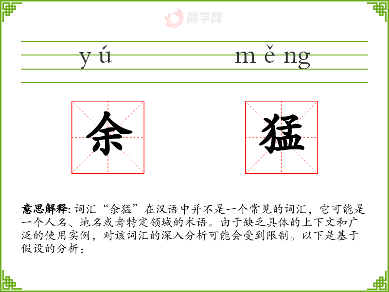 - 对于“余猛”这个词汇的理解,由于缺乏具体的上下文和广泛的使用实例,其含义和应用可能较为有限。在语言学习和表达中,了解特定词汇的背景和用法对于准确表达和理解至关重要。