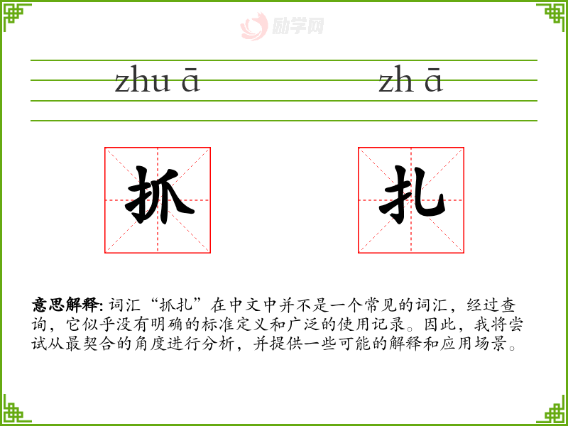 由于“抓扎”不是一个标准词汇,我们可以尝试从字面意思来解释:
