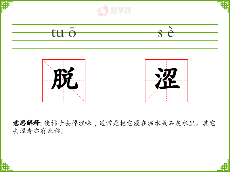 脱涩的意思是:使柿子去掉涩味﹐通常是把它浸在温水或石灰水里。其它去涩者亦有此称。