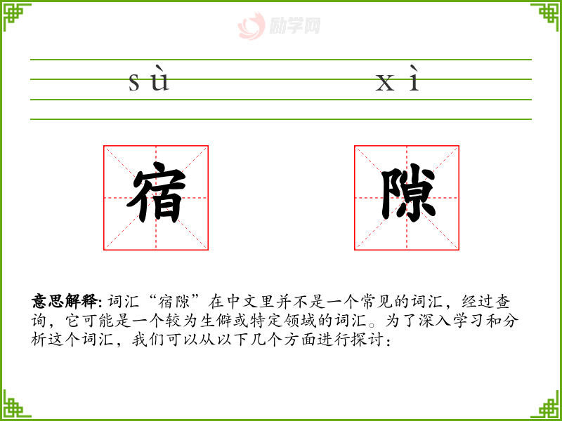 词汇“宿隙”在中文里并不是一个常见的词汇,经过查询,它可能是一个较为生僻或特定领域的词汇。为了深入学习和分析这个词汇,我们可以从以下几个方面进行探讨: