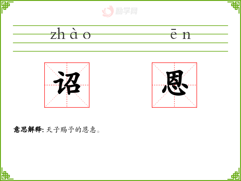 《说文新附》-诏,告也。 《礼记·曲礼》-负剑辟咡诏之,出入有诏于国。 蔡邕《独断》。注:“诏,诰也。有三品。”-上诏书者。 《穆天子传》-以诏后世。 《史记·绛侯周勃世家》-于是上乃使使持节诏将军。 清·徐珂《清稗类钞·战事类》-集谢庄少年之精技击者而诏之曰。
