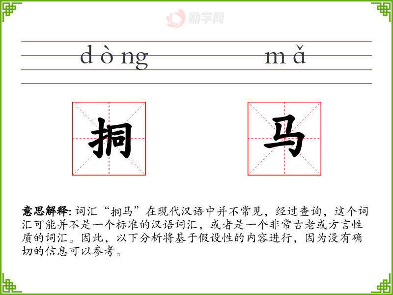 由于“挏马”不是一个现代标准词汇,对其的理解和应用可能仅限于历史或文化研究的范畴。在语言学习和表达中,了解这样的词汇可以帮助我们更好地理解语言的多样性和历史深度。