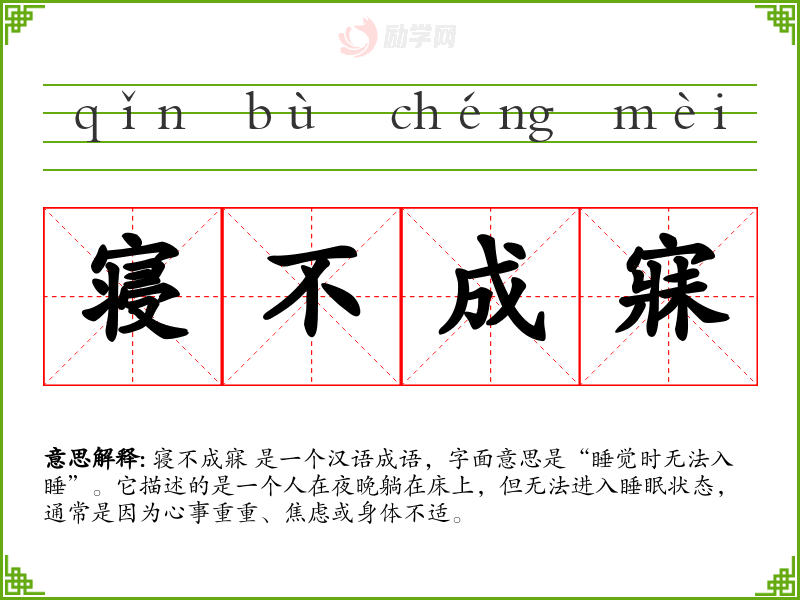 寝不成寐 是一个汉语成语,字面意思是“睡觉时无法入睡”。它描述的是一个人在夜晚躺在床上,但无法进入睡眠状态,通常是因为心事重重、焦虑或身体不适。