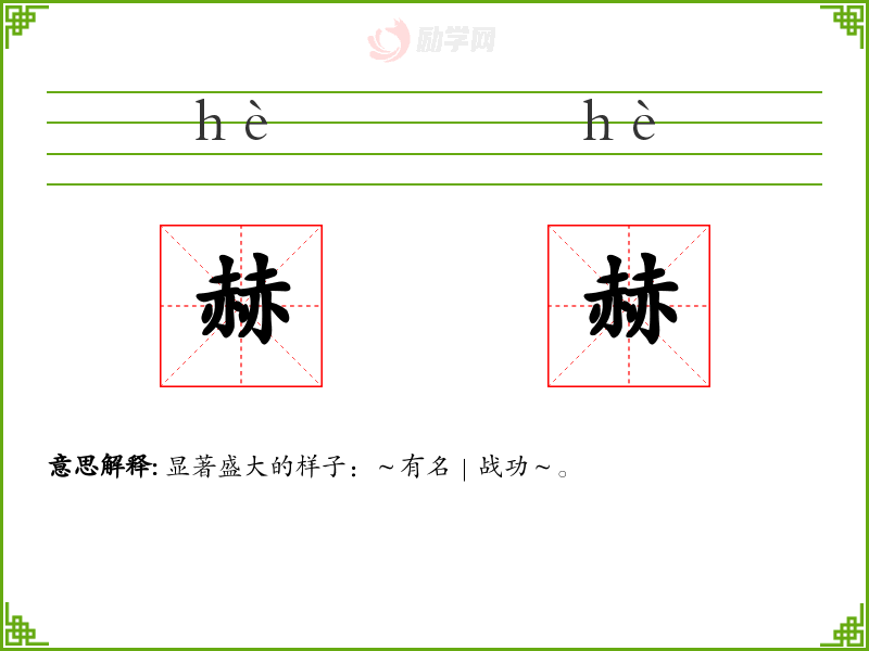 赫赫的意思是:显著盛大的样子:~有名|战功~。