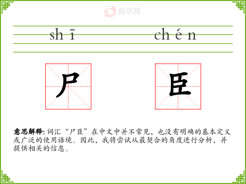 “尸臣”这个词汇在现代汉语中并不常见,字面意思可能是指“尸体”和“臣子”的组合。然而,这个词汇在古代文献中也没有明确的定义或使用记录。