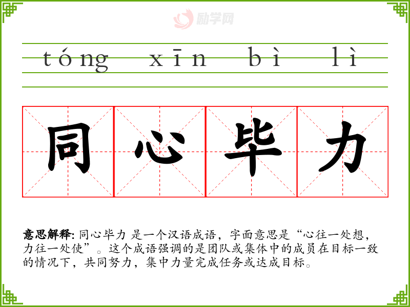 同心毕力 这个成语在我语言学和表达中具有重要意义,它不仅强调了团队合作的重要性,也提醒我在面对挑战时,应该寻求合作和团结。通过学和应用这个成语,我更加理解了集体力量的价值,并在实际生活中不断实践这一理念。