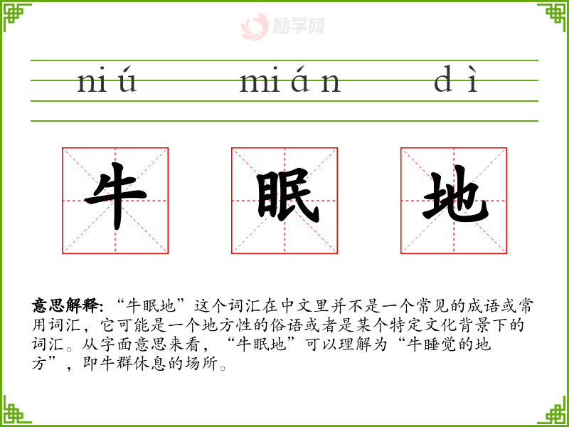 “牛眠地”这个词汇虽然不常见,但它可以作为一个有趣的切入点,探讨语言的地方性和文化性。在语言学习和表达中,了解和掌握这样的词汇可以帮助我们更深入地理解特定文化背景下的语言使用和表达方式。
