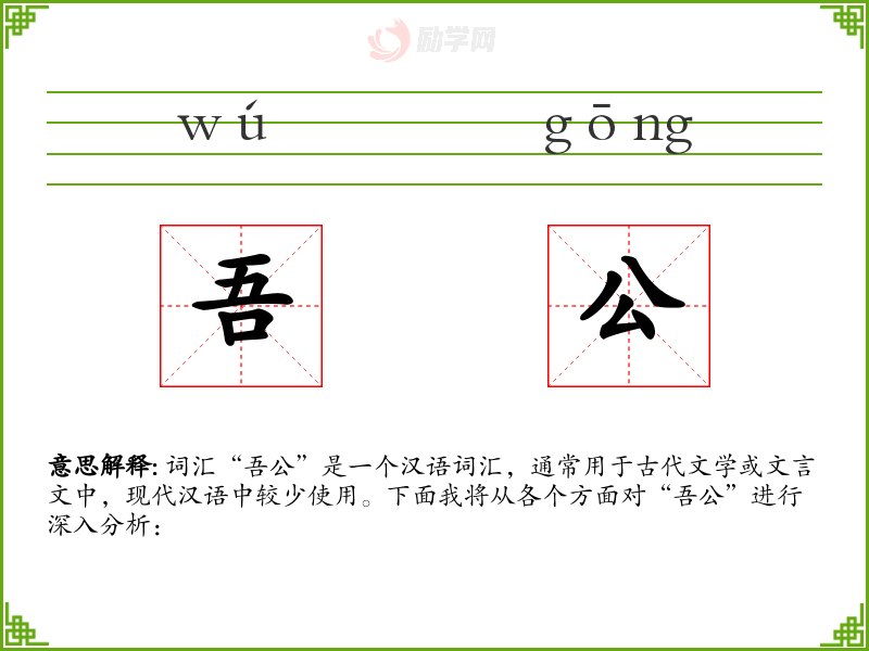 词汇“吾公”是一个汉语词汇,通常用于古代文学或文言文中,现代汉语中较少使用。下面我将从各个方面对“吾公”进行深入分析: