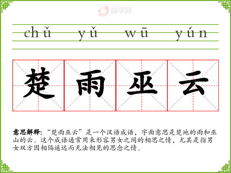 “楚雨巫云”这个成语源自中国古代文学,特别是诗词中。楚地和巫山都是中国古代文化中的重要地理符号,常被用来象征遥远和神秘。随着时间的推移,这个成语逐渐被用来形容男女之间的深情和相思。