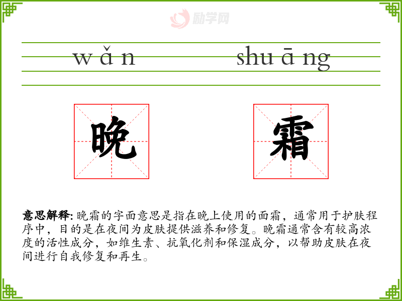 晚霜作为一个词汇,不仅仅是护肤产品的名称,它还承载着人们对美容和自我关爱的期待。在学习语言和表达中,了解这样的词汇可以帮助我们更好地理解和参与到相关的文化和社会对话中。