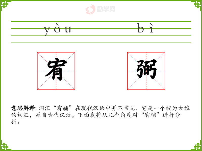 词汇“宥辅”在现代汉语中并不常见,它是一个较为古雅的词汇,源自古代汉语。下面我将从几个角度对“宥辅”进行分析: