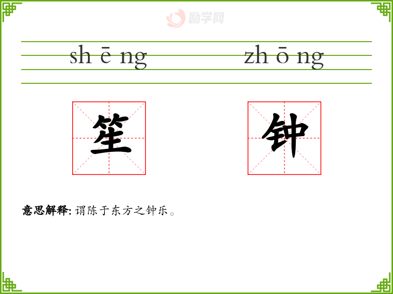 《说文》-笙,十三簧象凤之身也。笙,正月之音,物生故谓之笙。 《尔雅》-大笙谓之巢,小者谓之和。 《风俗通》-笙长四尺。 《仪礼·乡射礼记》注-三人吹笙,一人吹和。盖小者。 《诗·小雅·鹿鸣》-我有嘉宾,鼓瑟吹笙。