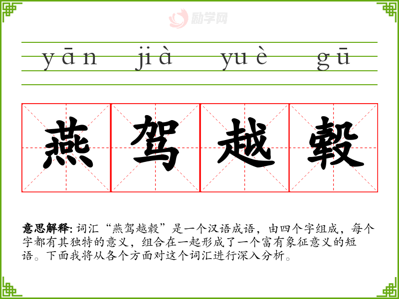 词汇“燕驾越毂”是一个汉语成语,由四个字组成,每个字都有其独特的意义,组合在一起形成了一个富有象征意义的短语。下面我将从各个方面对这个词汇进行深入分析。