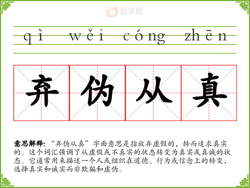 “弃伪从真”字面意思是指放弃虚假的,转而追求真实的。这个词汇强调了从虚假或不真实的状态转变为真实或真诚的状态。它通常用来描述一个人或组织在道德、行为或信念上的转变,选择真实和诚实而非欺骗和虚伪。