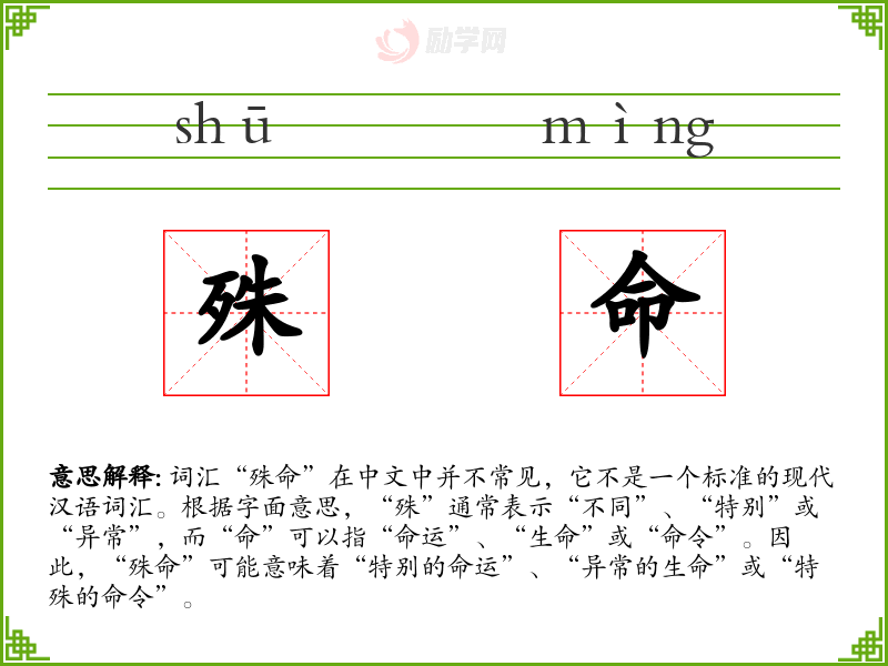 “殊命”这个词汇虽然不常见,但它提供了一种表达特殊命运或生命状态的方式。在我的语言学习和表达中,了解这样的词汇可以帮助我更丰富地表达复杂的情感和概念。