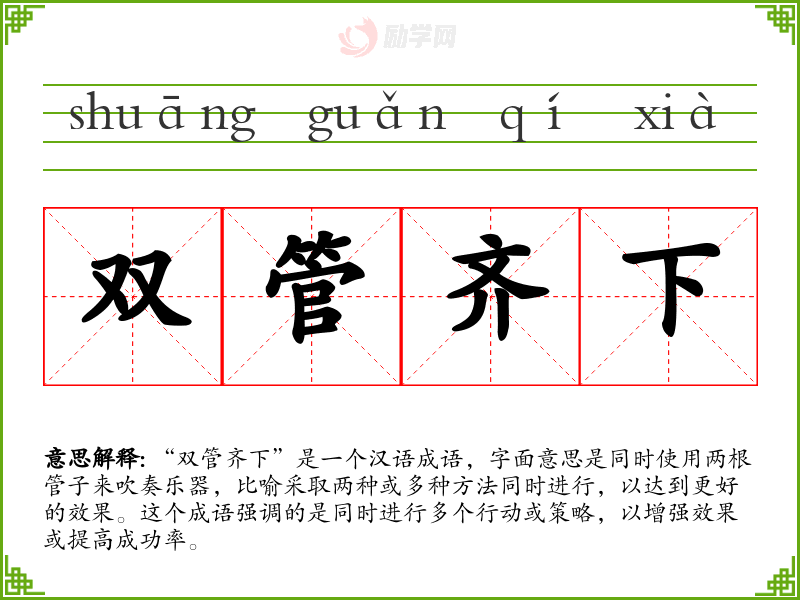 “双管齐下”是一个汉语成语,字面意思是同时使用两根管子来吹奏乐器,比喻采取两种或多种方法同时进行,以达到更好的效果。这个成语强调的是同时进行多个行动或策略,以增强效果或提高成功率。