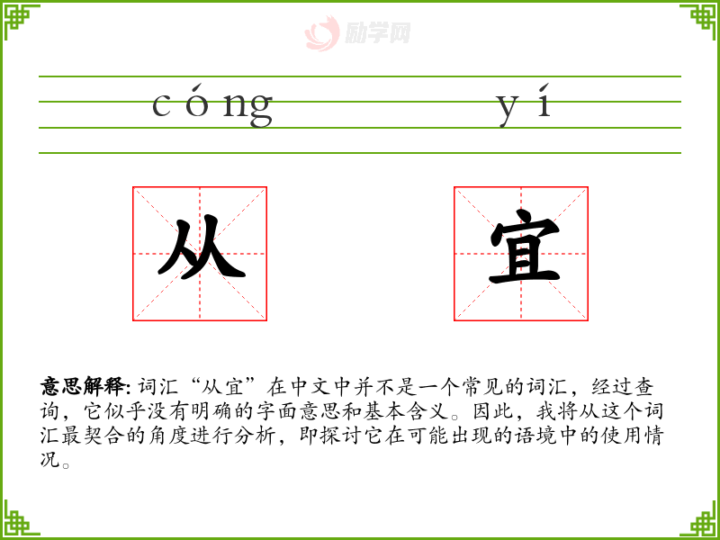 由于“从宜”不是一个标准词汇,我们可能需要从字面组合来推测其可能的含义。字面上看,“从”可以表示跟随、依照,而“宜”则表示适宜、合适。因此,“从宜”可能意味着按照适宜的方式或标准行事。