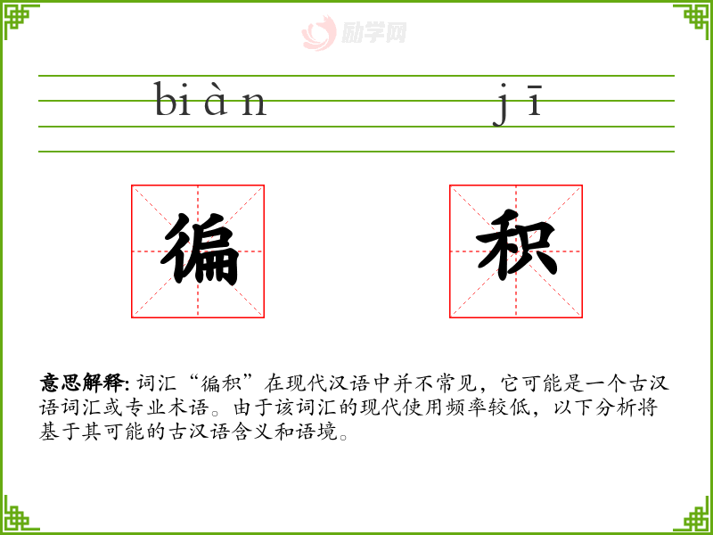 词汇“徧积”在现代汉语中并不常见,它可能是一个古汉语词汇或专业术语。由于该词汇的现代使用频率较低,以下分析将基于其可能的古汉语含义和语境。