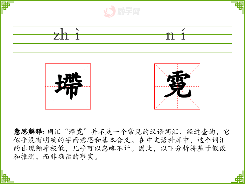 由于“墆霓”不是一个标准词汇,我们无法给出确切的定义。它可能是由两个字组合而成的,但每个字在现代汉语中也没有特定的组合意义。