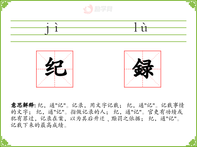纪,通"记"。记录,用文字记载; 纪,通"记"。记载事情的文字; 纪,通"记"。指做记录的人; 纪,通"记"。官吏有功绩或犯有罪过,记录在案,以为其后升迁﹑黜罚之依据; 纪,通"记"。记载下来的最高成绩。