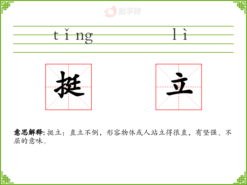 “挺立”一词由“挺”和“立”两个字组成。“挺”字古汉语中意为直、伸,“立”字意为站立。两者结合,形成了“挺立”这一词汇,强调直立不倒的状态。