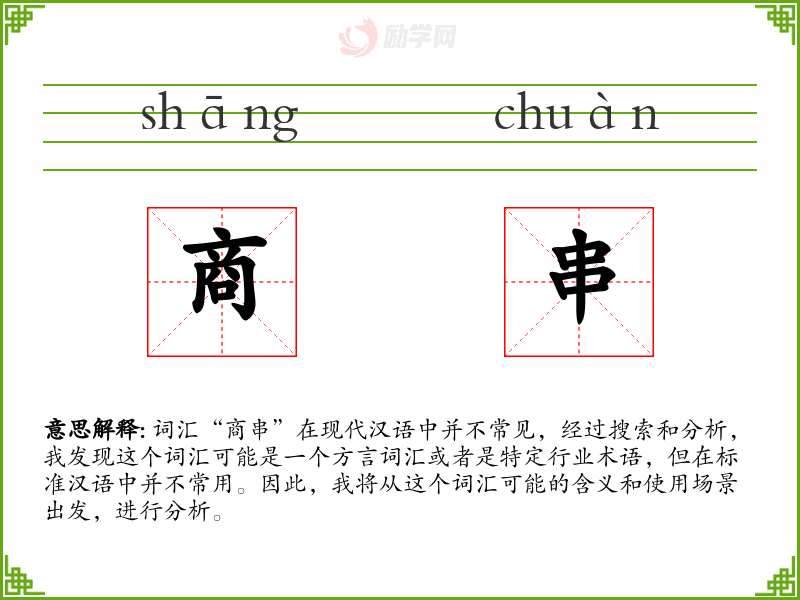 词汇“商串”在现代汉语中并不常见,经过搜索和分析,我发现这个词汇可能是一个方言词汇或者是特定行业术语,但在标准汉语中并不常用。因此,我将从这个词汇可能的含义和使用场景出发,进行分析。