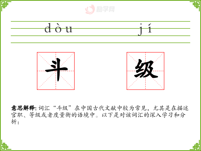 在日常生活中,这个词汇可能不太常用,但在学***古代历史或文化时,了解斗级的含义有助于更深入地理解相关内容。