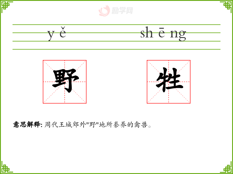 野牲的意思是:周代王城郊外"野"地所豢养的禽兽。