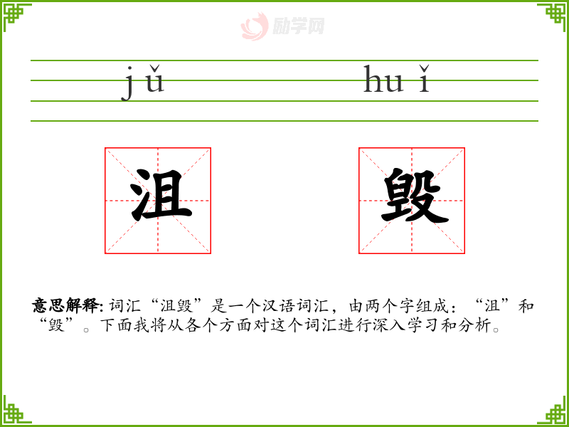 词汇“沮毁”是一个汉语词汇,由两个字组成:“沮”和“毁”。下面我将从各个方面对这个词汇进行深入学*和分析。