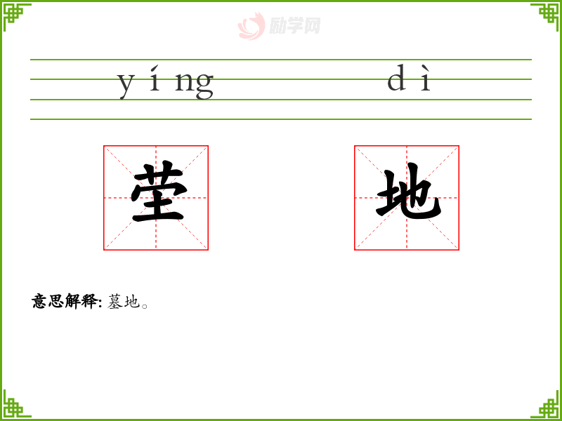 《说文》-茔,墓也。 《玉篇》-茔,墓地。 《广雅》-茔,葬地也。 《汉书·张安世传》。注:“冢地也。”-赐茔杜东。 《汉书》-太皇太后诏外家王氏田非冢茔,皆以赋贫民。